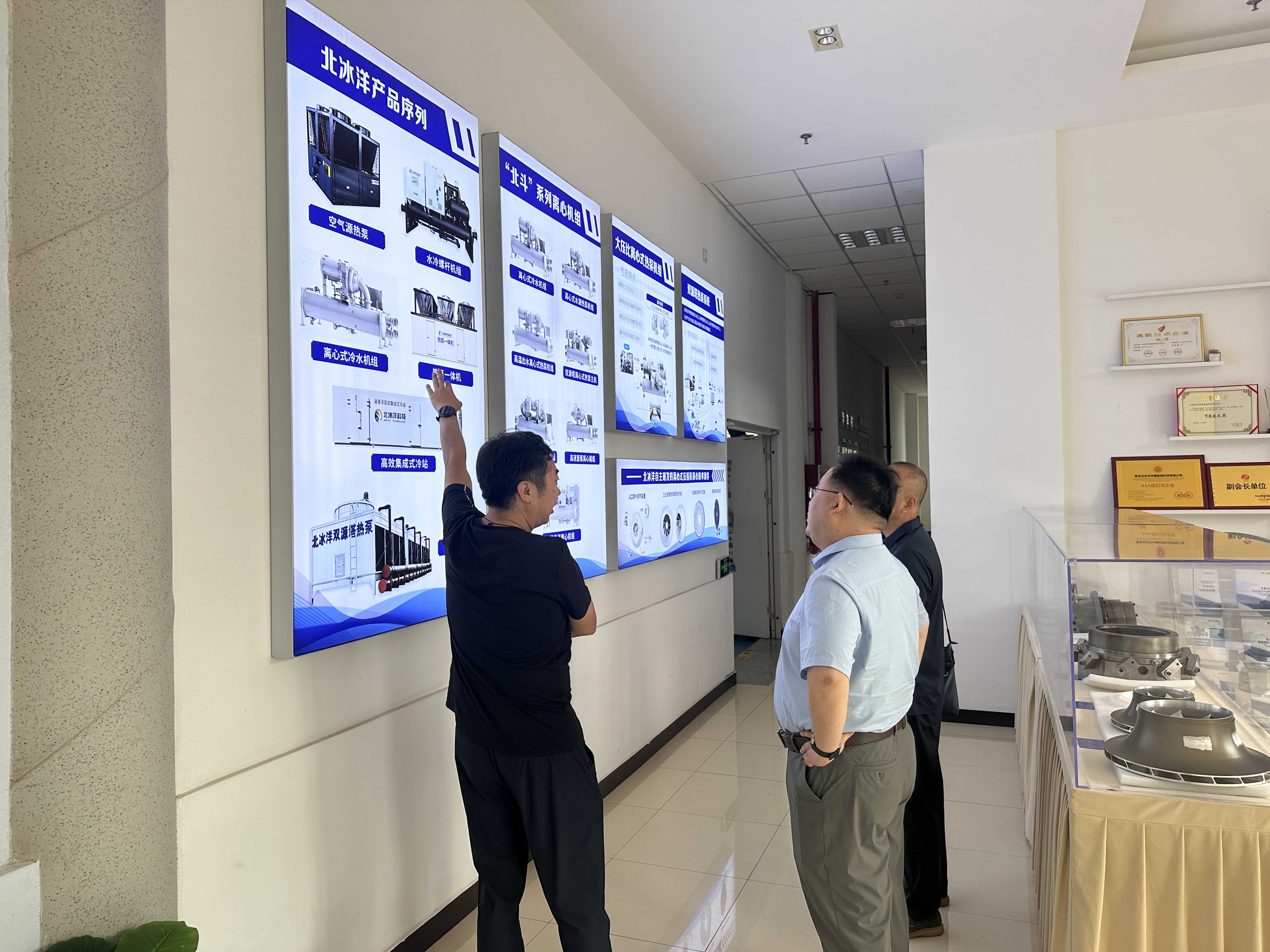 总经理王进杰带领大家共同参观了香蕉视频APP下载安装自主研发的国内首创大压比离心式热泵机组,机组设有单电机双轴伸驱动A,B压缩机头左右一体布置,可以协同工作,实现性能优化,离心机机组噪音测试低至80分贝,空气源热泵机组噪音低至64分贝,更加低震低噪。
